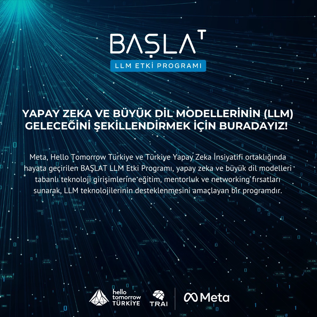Meta & Hello Tomorrow Türkiye & Türkiye Yapay Zeka İnisiyatifi paydaşlığında ve T.C. Cumhurbaşkanlığı Yatırım ve Finans Ofisi katkılarıyla yürütülen “BAŞLAT LLM Etki Programı 2025” eğitim seminerleri, mentörlük oturumları ve META teknik desteği ile devam ediyor. Teknoloji odaklı girişimciliği teşvik eden BAŞLAT LLM Etki Programı, ikinci yılında üretken yapay zekâ ve açık kaynak LLM çözümleri geliştiren startuplara sunduğu kapsamlı destek ile Türkiye ve dünyada olumlu bir etki yaratma amacını taşıyor. Küresel pazarda rekabet gücü kazanmak isteyen Türkiye’de kurulmuş girişimlere Türkiye Yapay Zeka Zirvesi İnovasyon Sahnesi’nde toplam 50 bin dolar ödül dağıtılacak. Birinciliği kazanan girişim ayrıca Dubai’de düzenlenecek Llama Impact Award’da 100 bin dolar destek ödülü alma şansı yakalayacak.